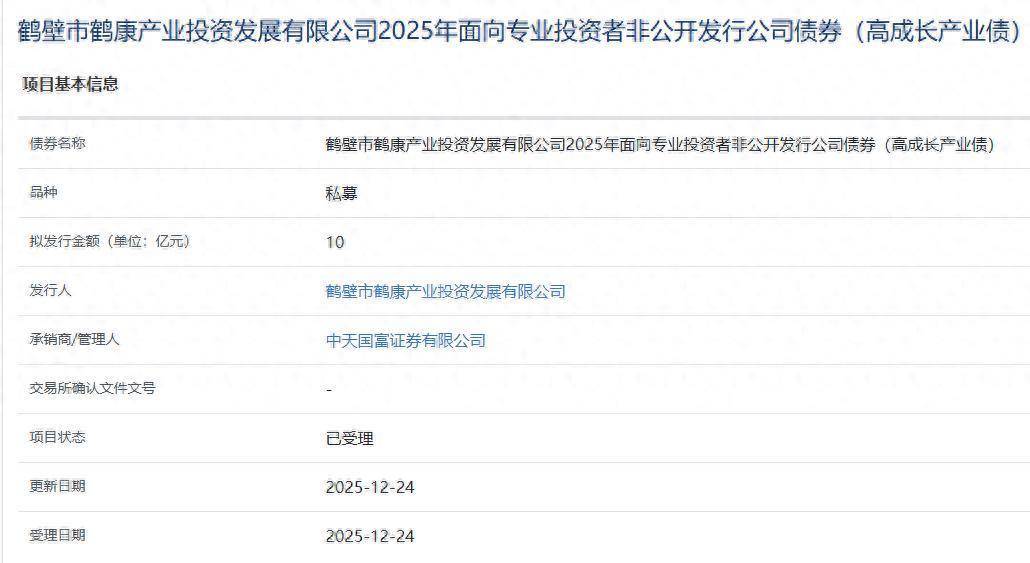 【大河财立方消息】12月25日消息,鹤壁市鹤康产业投资发展有限公司2025年面向专业投资者非公开发行公司债券(高成长产业债)项目获上交所受理。本期债券拟发行规模10亿元,承销商/管理人为中天国富证券。